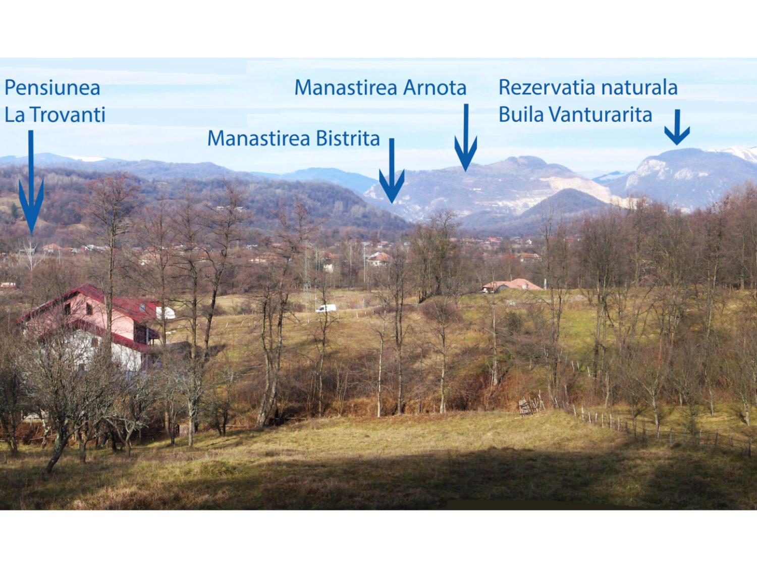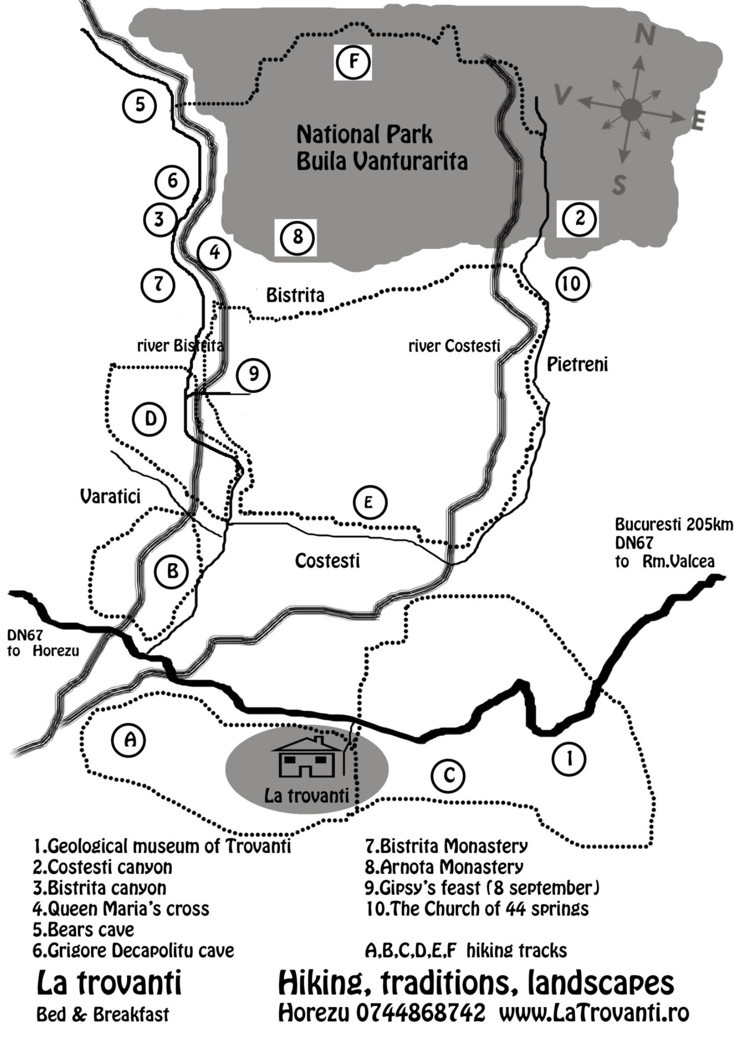 Pensiunea La Trovanti va ofera cazare in apropierea manastirilor din zona Horezu si drumetie in rezervatia naturala Buila Vanturarita(1894m). La distanta de 8km se pot vizita: manastirea Horezu, muzeul trovantilor cheile raului Bistrita, manastirea Bistrita pestera ursilor, pestera Grigore Decapolitul manastirea Patrunsa <traseu 1.5ore> pestera Muierii 25km manastirea si pestera Polovraci 20km                                                        O vacanta cu multe locuri de vizitat !